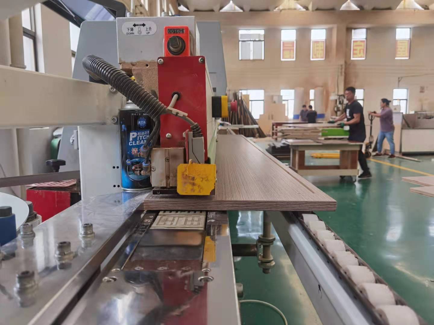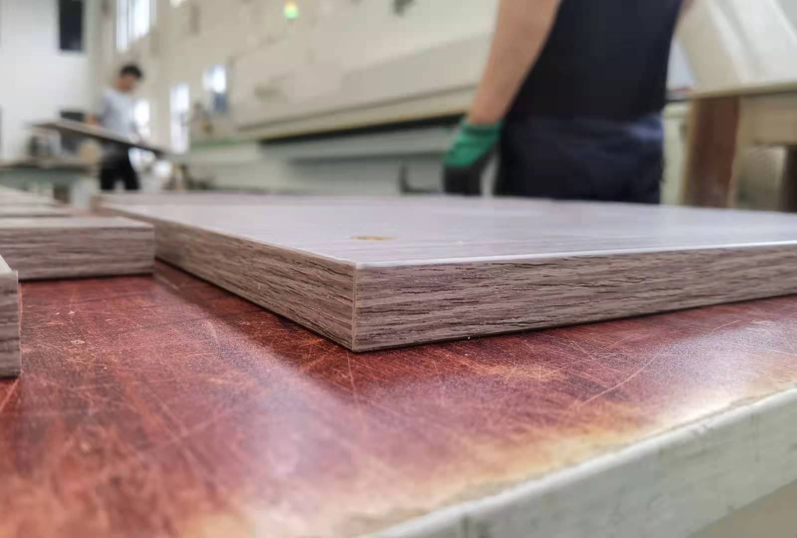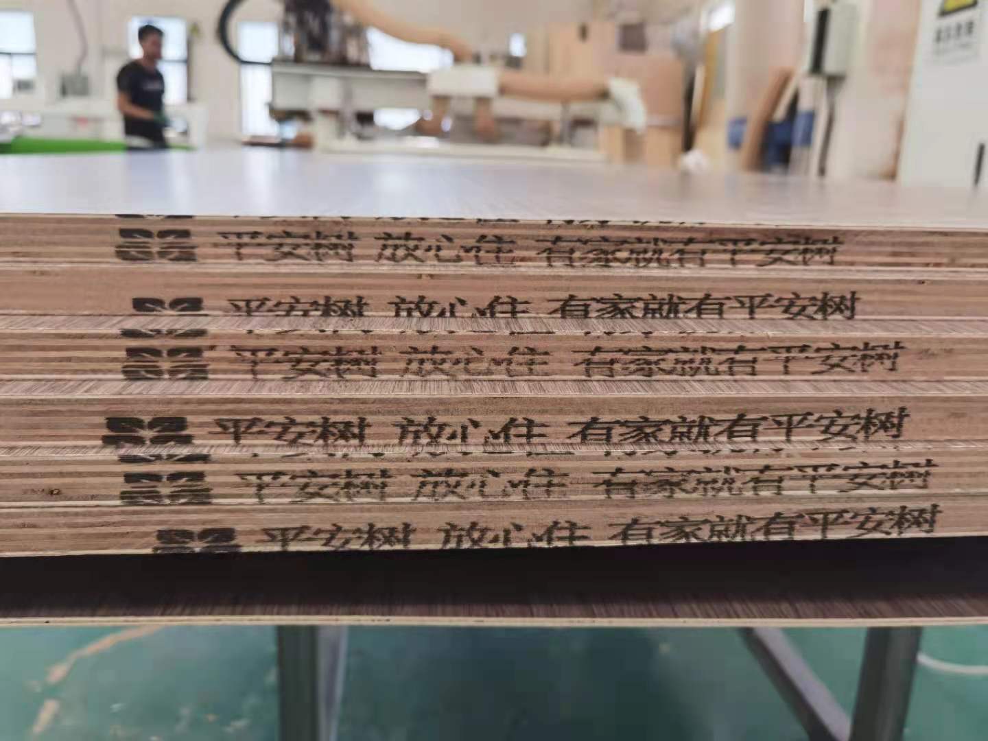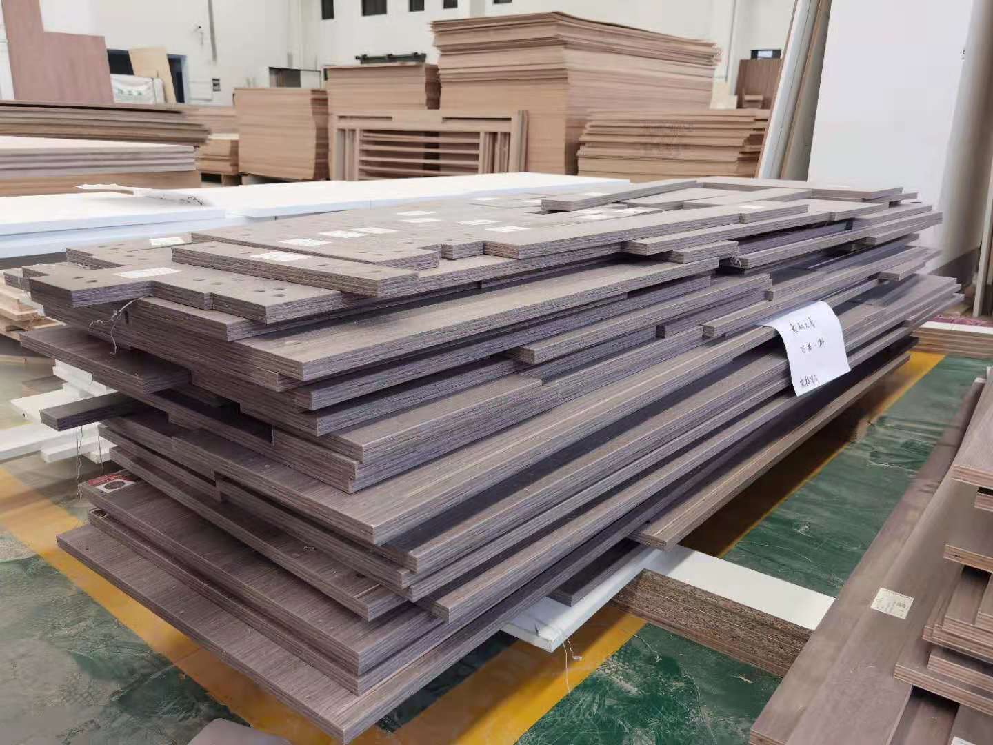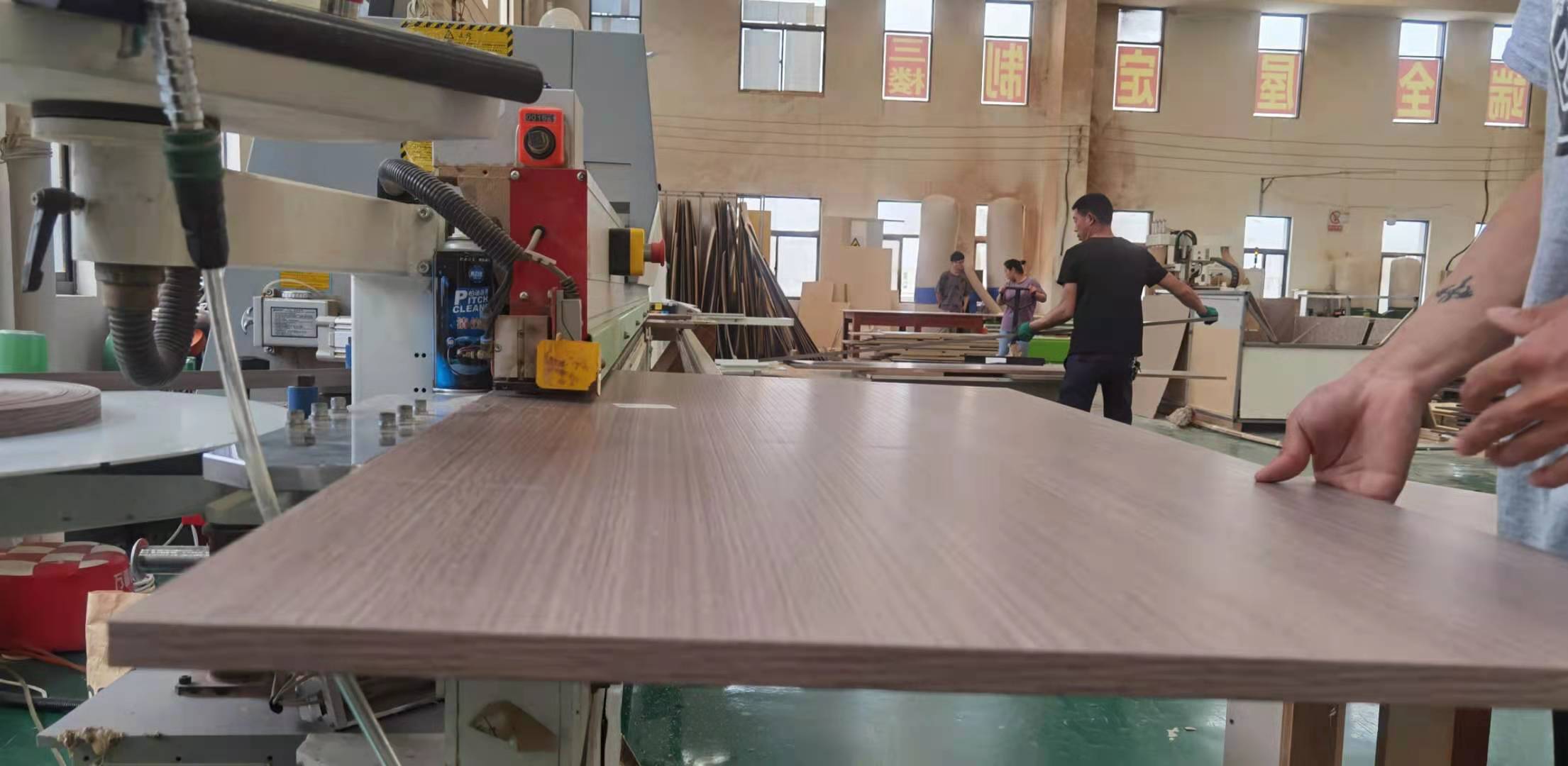 開始制作啦,專業設備裁板,板材使用平安樹實木多層E0級制作,有高級的藍光防偽標識哦,邊口都是直的,沒有爆邊的情況,這樣后面封出來的板更圓滑,全自動機器開料尺寸更精準,拆好的板材師傅都整整齊齊的放在墊板上,板下面都墊了墊板的哦,第一防止地面有東西劃傷,第二防潮。