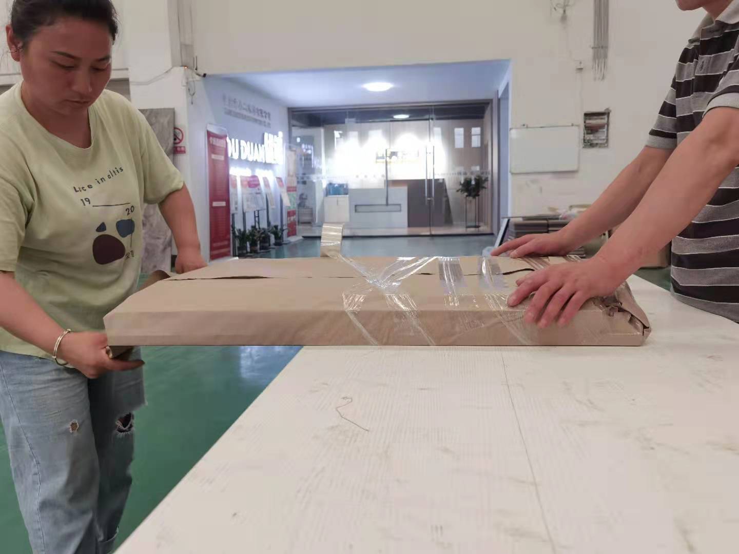 打孔,封邊完畢,已進入打包環節。柜門師傅會用柏油清洗劑全部擦拭一遍,以保證裝到客戶家整潔美觀。我家柜子每塊板都是整個打包起來的,以防運輸過程中劃傷或者磕碰到,跟板材下面墊板一個原理哦!等全部打包好就可以聯系客戶送貨咯!